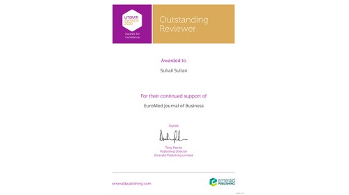 حصل الأكاديمي الفلسطيني د. سهيل سلطان، على جائزة "Emerald Literati Awards for Excellence" البريطانية، لإسهاماته كمحكّم متميّز في مجلة EuroMed Journal of Business خلال عام 2019.